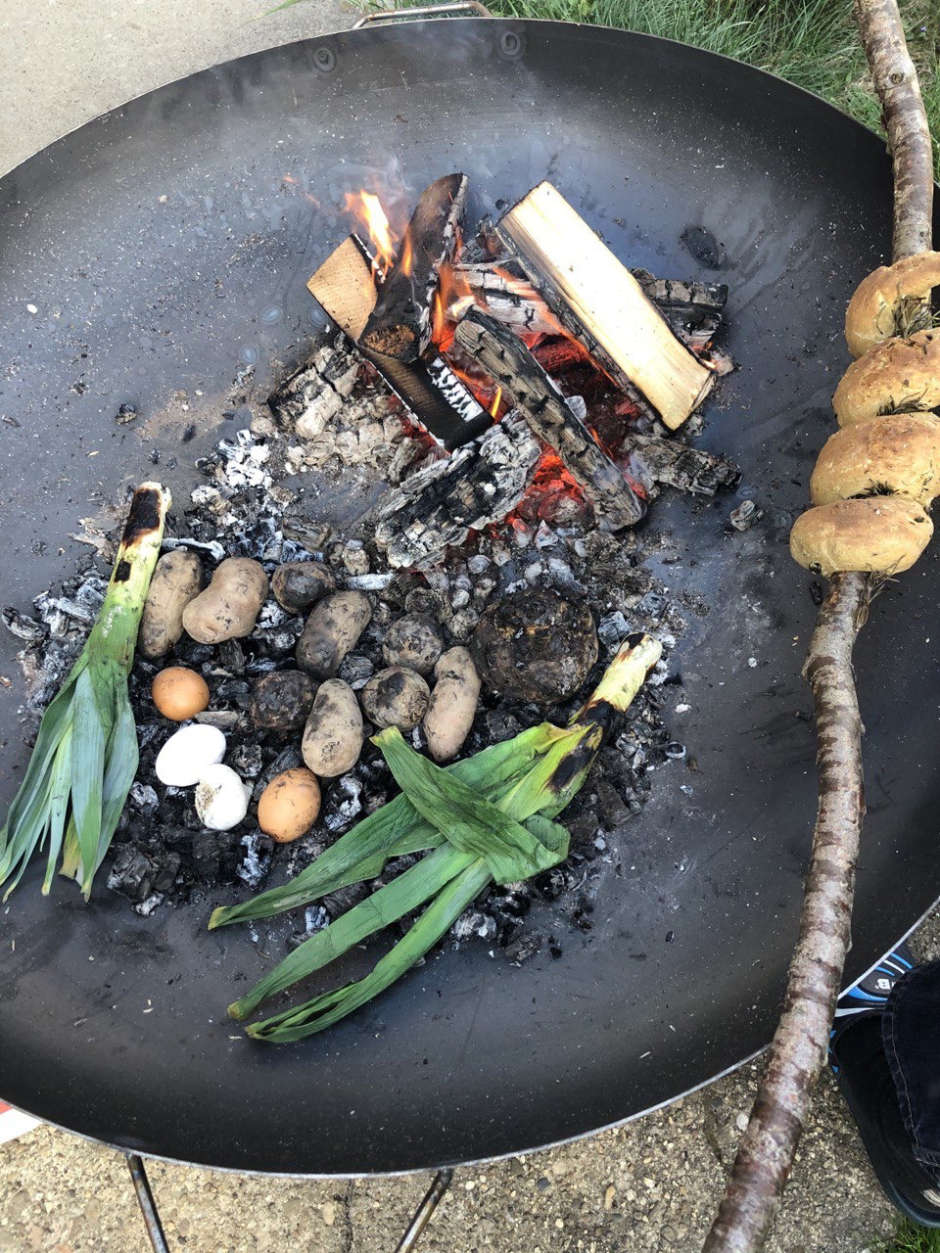 Ich lernte direkt in der Glut kochen. Mittlerweile weiss ich, dass es viele Möglichkeiten gibt, mit dem Feuer zu kochen. Mich fasziniert das Zubereiten in der Glut sehr, denn da bin ich dem Feuer, seiner Physik und somit der Natur am nächsten. Ich kaufte mir nach diesem Tag im Januar eine eigene grosse Feuerschale. Nachdem ich ins Emmental umzog, weihte ich die Schale ein.