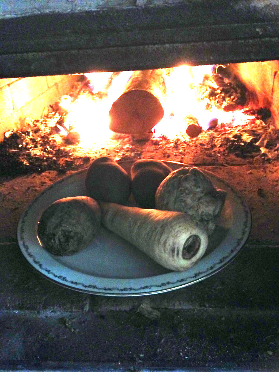 Ich wohne jetzt in einem alten Emmentaler Häuschen. Wir heizen mit Holz, in einem Kachelofen. Ja auch darin kann ich in der Glut garen, welch Genialität. Ich empfehle es allen, die einen solchen Ofen zu Hause haben. Wenn das Holz abgebrannt ist und die Glut im Ofen übrig bleibt, kannst du etwas Glut nach vorne schaufeln. Dann legst du mitsamt der Schale z.B eine Rande, eine Knollensellerie, Pastinaken und auch ein Spitzkohl auf die Glut. Stelle immer die Uhr. Weil der Ofen wie ein Backofen wirkt, benötigt es nicht sehr lange. Du merkst für dich, wie lange du es garen möchtest.